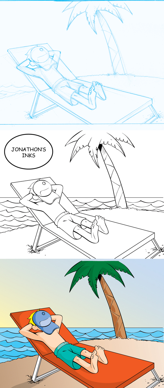 As you can see in the layout below, there's 3 images. The sketches (top) in blue pencil; The inks, (middle); And then the color (bottom).